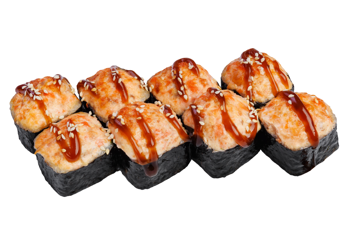 Запеченное суши с тунцом внутри и шапочкой из розового соуса сверху
